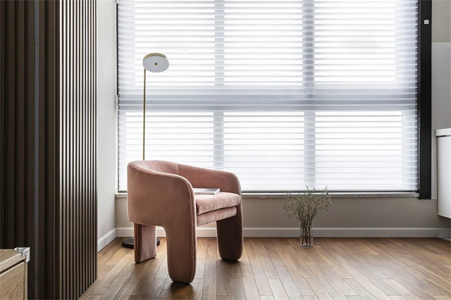 珊瑚橙单椅纯净浪漫,风从窗外吹来,柔柔的带着春天的味道,整面百叶窗,保留了空间的通透感。