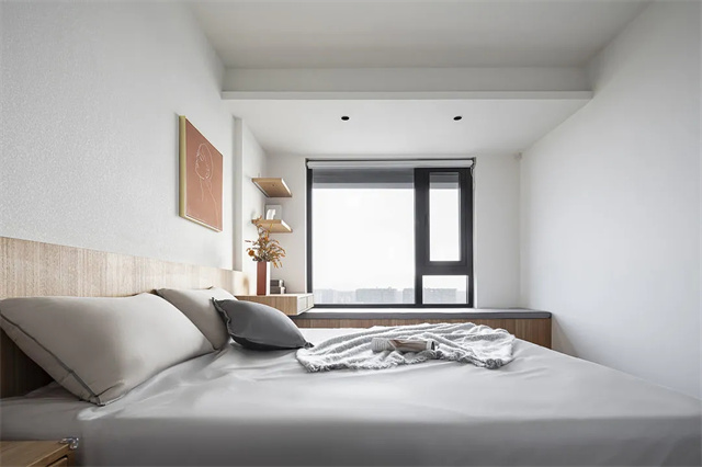 原户型中有一个飘窗,因为结构原因不能敲掉,干脆把飘窗和床头的小桌子连到了一起。